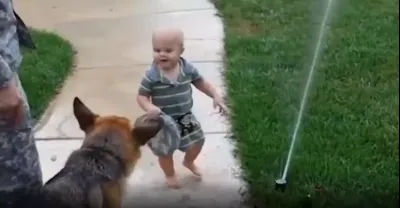 小主人指揮狗狗玩水,接下來請憋住別笑