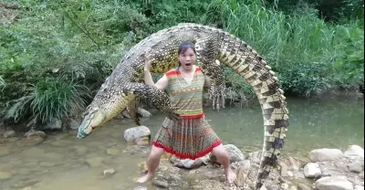 聰明的女孩用手抓住大鱷魚,原始生活捕捉鱷魚的技能