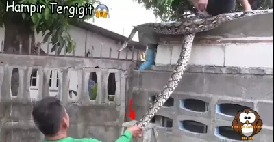 男子捕抓大蟒蛇,大蟒蛇躲藏在房屋的屋頂上