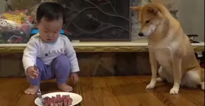 狗狗乖乖等待小主人喂牛排,下一秒請憋住不要笑
