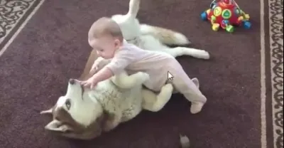 小寶寶撩哈士奇,二哈的反應太逗了,網友:看完憋住別笑