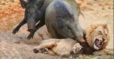 疣豬戰鬥獅子以拯救另一隻疣豬,太厲害了