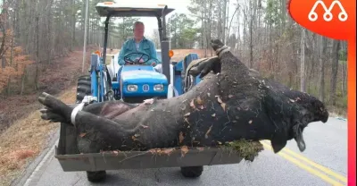 老外捕獲大野豬,巨豬是由拖拉機裝載著