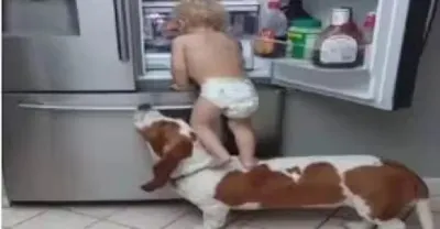 狗狗和寶寶合作偷零食,不料老媽突然過來了,狗狗的舉動太搞笑了