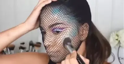國外女子為追求時尚,居然用漁網襪化妝,取下絲襪後被驚艷到了!