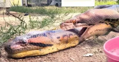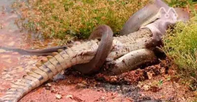 兩條巨莽爭奪獵物 到底鹿死誰手
