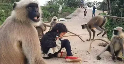 這長尾猴真的很壞,小妹妹好心給它們花生吃,吃完了還要欺負她,結果把小妹妹弄哭了。