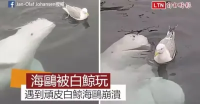 海鷗吃魚遇白鯨示「善意」 崩潰放棄大餐:放過我!