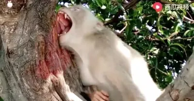 遊客扔給猴子一個朝天椒,猴子咬一口後當場發飆,鏡頭記錄全過程