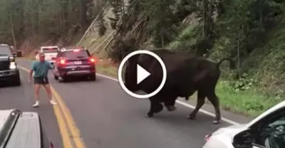 男人故意惹2000磅重量級野牛立刻被撞飛,網民:活到不耐煩?野牛全力一擊應該能見耶穌了!