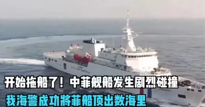 開始拖船了!中菲艦船發生劇烈碰撞,我海警成功將菲船頂出數海里