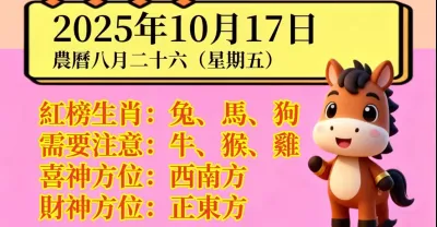 明日小運播報~2025 年 10 月 17 日(星期五)農曆八月二十六