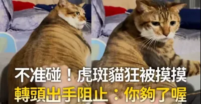 不准碰!虎斑貓狂被摸摸 轉頭出手阻止:你夠了喔