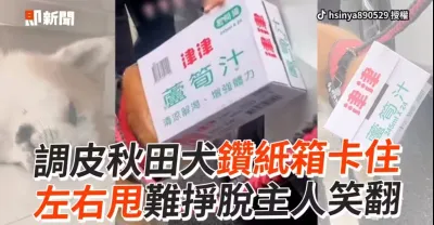 秋田犬散步頭鑽紙箱卡住...左右甩主人笑翻