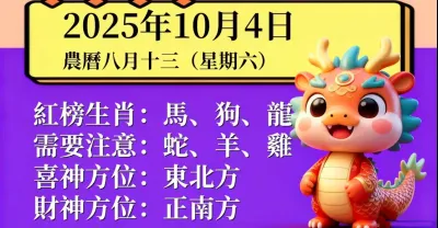 明日小運播報~2025 年 10 月 4 日(星期六)農曆八月十三