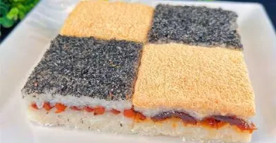 古早味糕點:福建人的傳統糕點,早期是加硼砂的,現在換了鹼水替代,放涼冷藏後,口感QQ彈彈,淋上糖漿一級棒,家裡有老人家的可做起來。鹼水糕/alkaline rice cake/Tee Nya Kuih