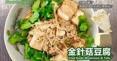 《金針菇豆腐 | Fried Enoki Mushroom & Tofu》 一道清淡又美味的素菜,金針菇鮮嫩、豆腐爽滑、超級下飯,老少咸宜,天天吃都不膩。烹法簡單快速,快來試試看吧!