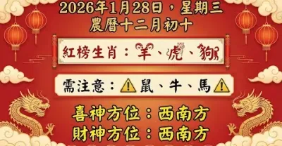 明日小運播報~2026年1月28日(星期三) 農曆十二月初十~羊、虎、狗大吉